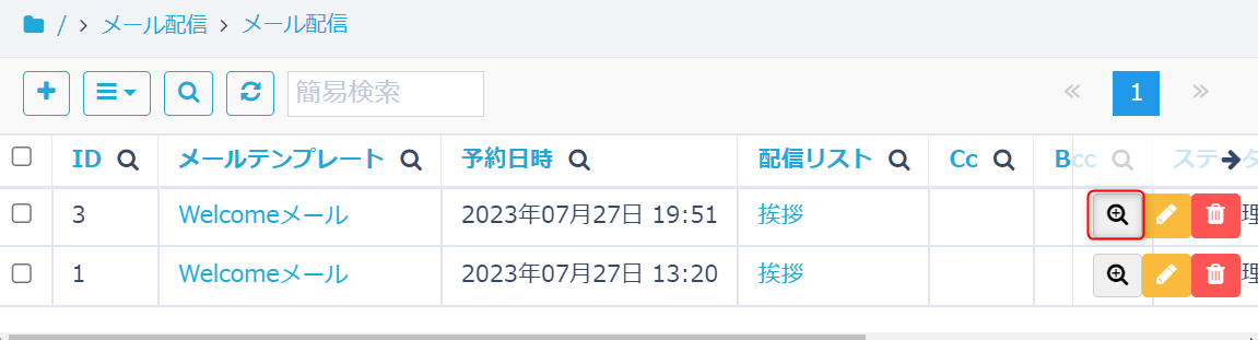②配信結果を確認したいメールテンプレートの右横に表示されている、「虫眼鏡」ボタンをクリック