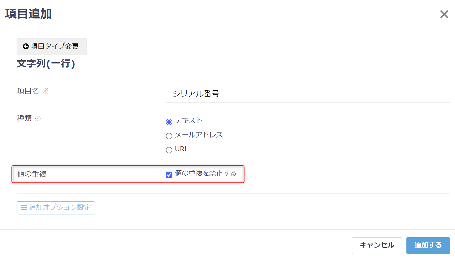 ※シリアル番号の特性上、重複はありえないという前提のもと、「値の重複を禁止する」にチェックを入れてください。