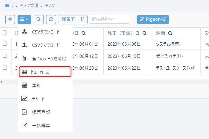 テーブル一覧画面の左上アイコンから「ビュー作成」を選択します。