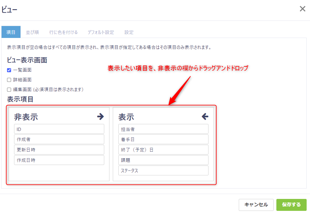 最初はすべての項目が非表示欄に表示されていますので、表示させたい項目だけ、「表示」欄にドラッグアンドドロップします。