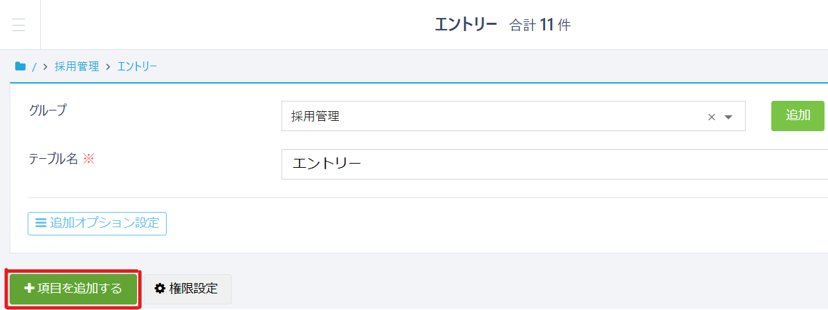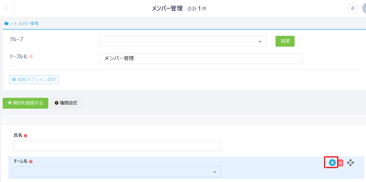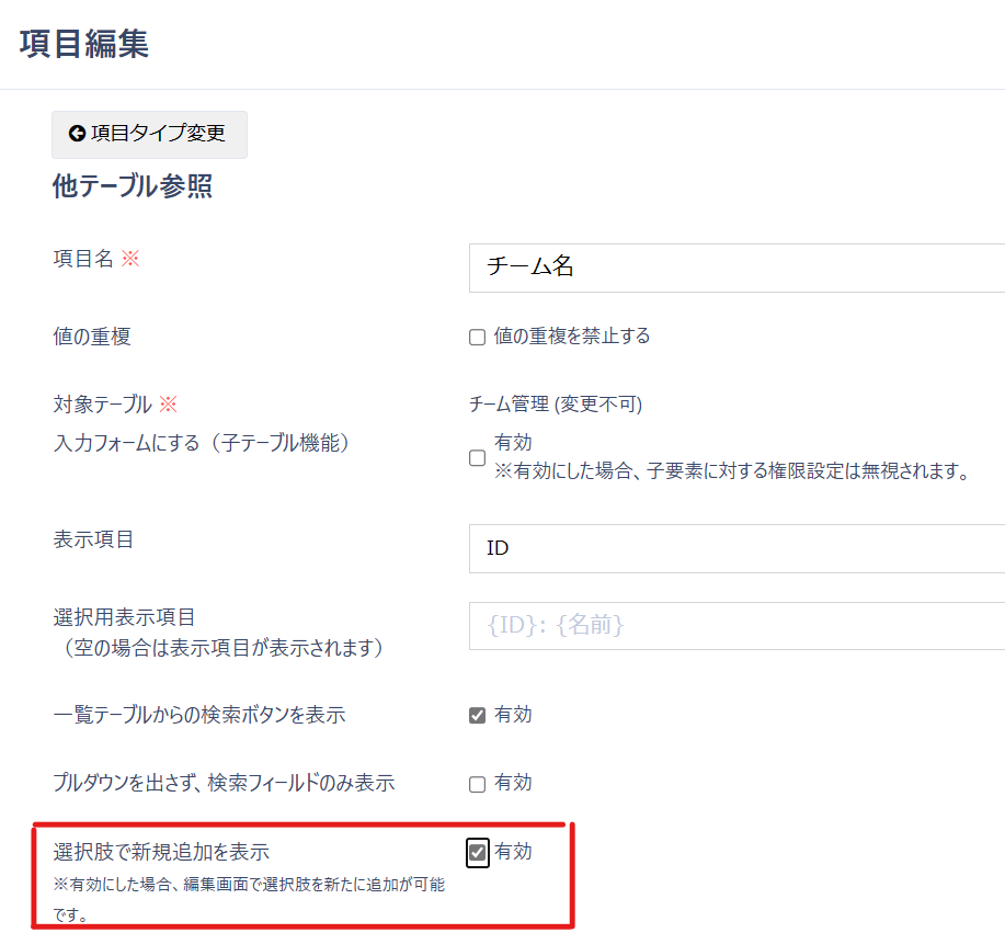 「チーム管理」テーブルが作成されていない場合は先に作成します。 項目名を入力し必要に応じて以下設定項目の設定を行います。