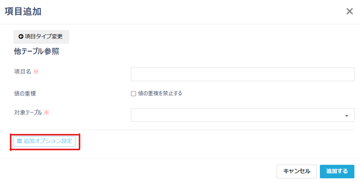以下の通り、「他テーブル参照」項目のリストメニューより「+新規追加」を選択します。