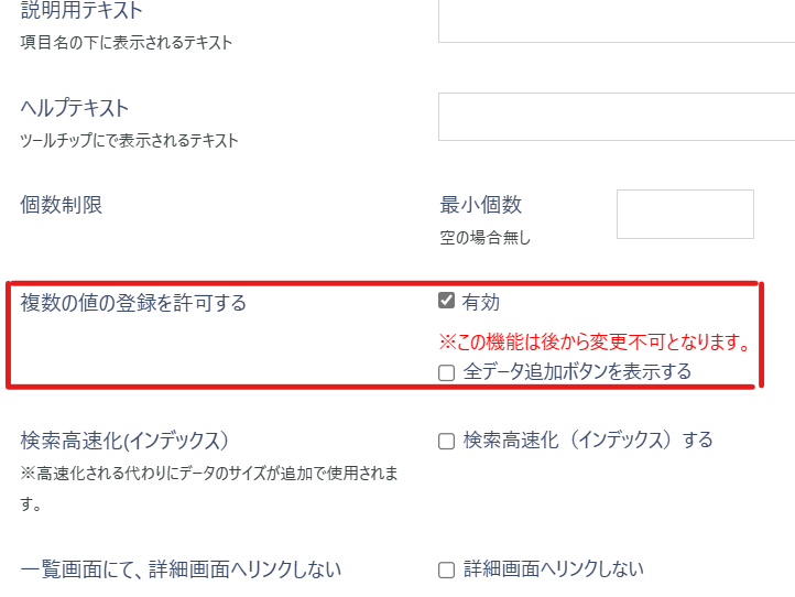 | 複数の値の登録を許可する | 項目の値を複数登録可能とすることができます。複数登録可能とする場合、「複数の値の登録を許可する」の有効にチェックを入れます。本機能は登録後の変更は不可となりますのでご注意ください。また有効にした場合、個数制限(最小/最大個数)の設定が可能です。 |