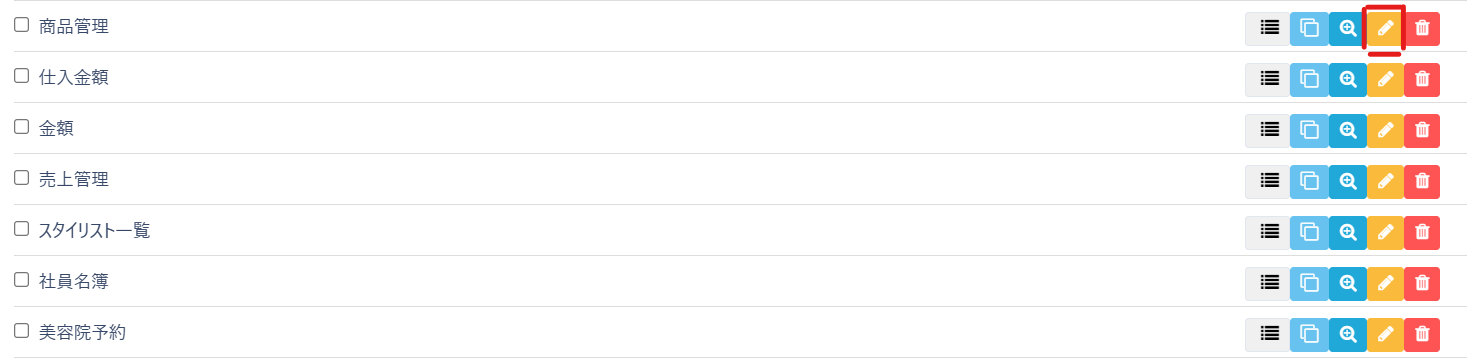 「テーブル管理」の一覧より、項目のタイプ変更を行うテーブルの「編集」アイコンをクリックします。
