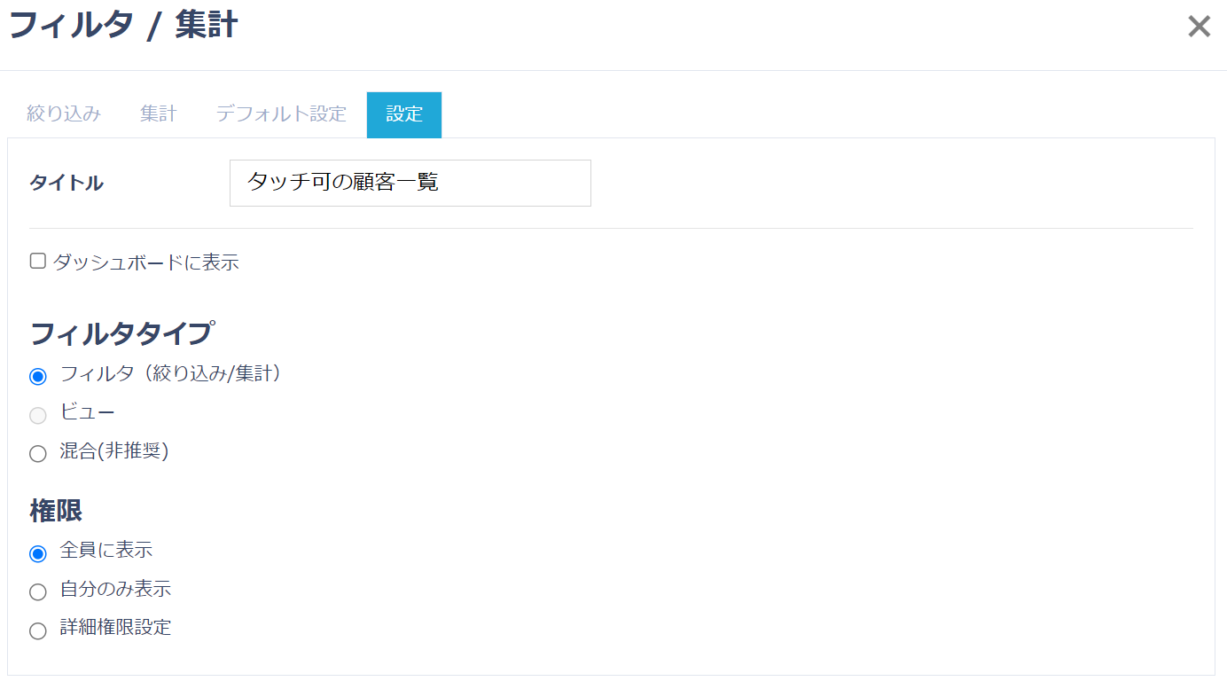 「設定」タブにて、集計の名前を付けて保存します。フィルタタイプはフィルタ(絞り込み/集計) とします。